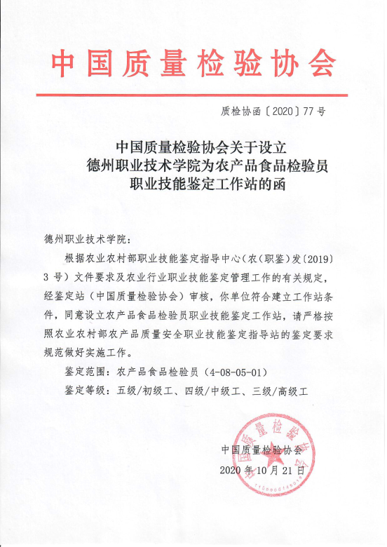 2020年10月21日,中国质量检验协会下发《中国质量检验协会关于设立2026世界杯官网为农产品食品检验员职业技能鉴定工作站的函》(质检协函﹝2020)77号),世界杯官网成功获批中国质量检验协会农产品食品检验员鉴定站资质!