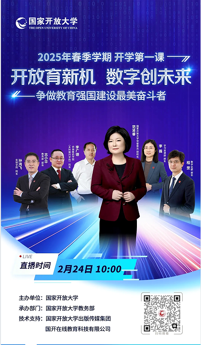 2025年2月24日(周一)上午10:00,国家开放大学党委委员、副校长范贤睿将以视频直播方式主讲“开学第一课:开放育新机 数字创未来——争做教育强国建设最美奋斗者”,敬请关注。