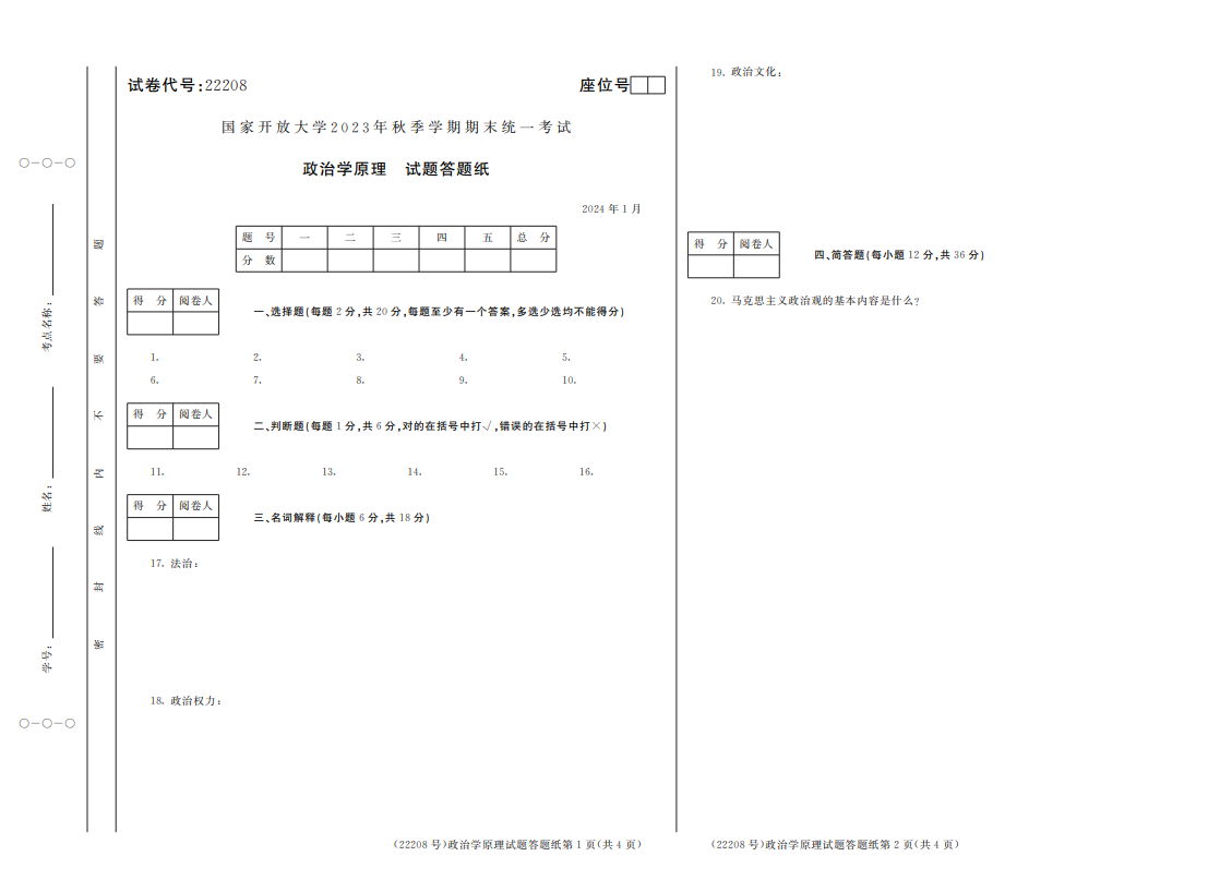 4.将装订好的答题纸连同试题一起装入试卷袋内,并将密封签贴在试卷袋封口上。