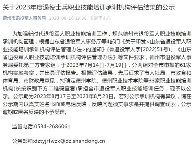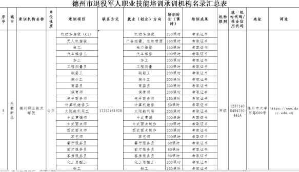 德州市退役军人事务局于2023年8月23日公示完毕,共有33家机构入选。世界杯官网成功入选德州市退役军人技能培训承训机构。