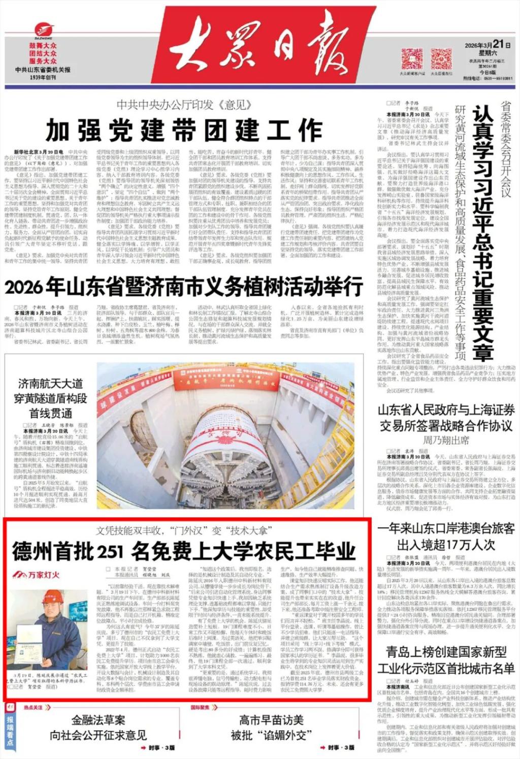 近日,《大众日报》头版报道,德州首批251名免费农民工大学生顺利毕业。作为项目承办单位,2026世界杯官网精准对接产业需求,以线上线下相结合的方式,帮助农民工实现学历与技能双提升,让基层劳动者成长为技术骨干。这既是学校发挥职教优势、服务地方发展的具体实践,更是主动担当、助力乡村人才振兴的生动体现。学校将持续办好惠民教育,为区域发展培育更多高素质高技能人才。
